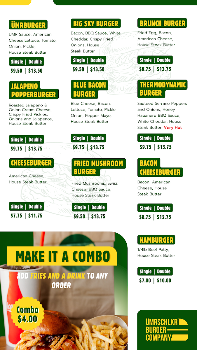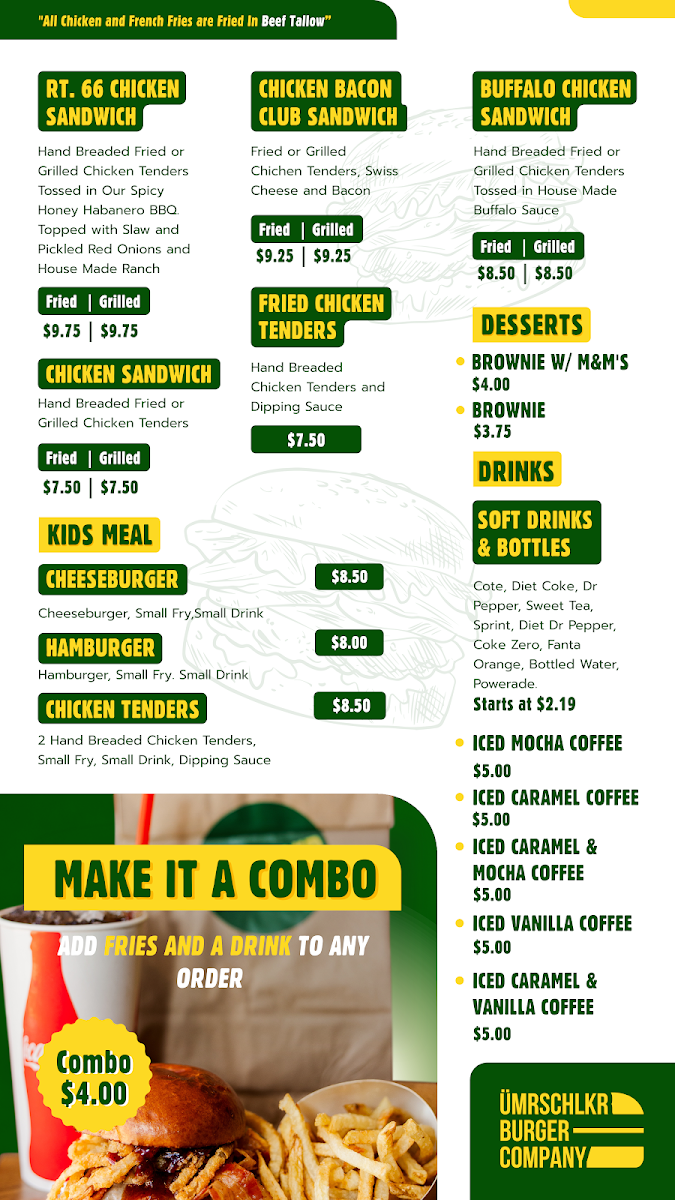 Seafood options, including fried and grilled salmon patties, add a delightful twist for those seeking something different. House-made creamy slaw and uniquely seasoned fries complement the hearty mains, while a selection of classic sodas completes the meal. The attentive, lively staff enhance the dining experience, making UMRSCHLKR BURGER COMPANY a spot where gourmet meets friendliness in a casual setting. This menu is a compelling invitation for anyone craving bold, fresh comfort food done right.